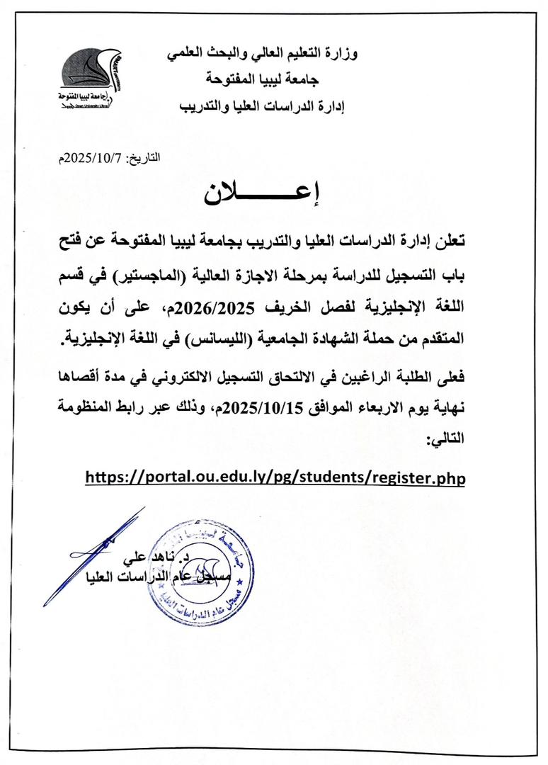 تعلن إدارة الدراسات العليا والتدريب بجامعة ليبيا المفتوحة عن فتح باب التسجيل للدراسة بمرحلة الاجازة العالية (الماجستير) في قسم اللغة الإنجليزية لفصل الخريف 2025/2026م، على أن يكون المتقدم من حملة الشهادة الجامعية (الليسانس) في اللغة الإنجليزية.