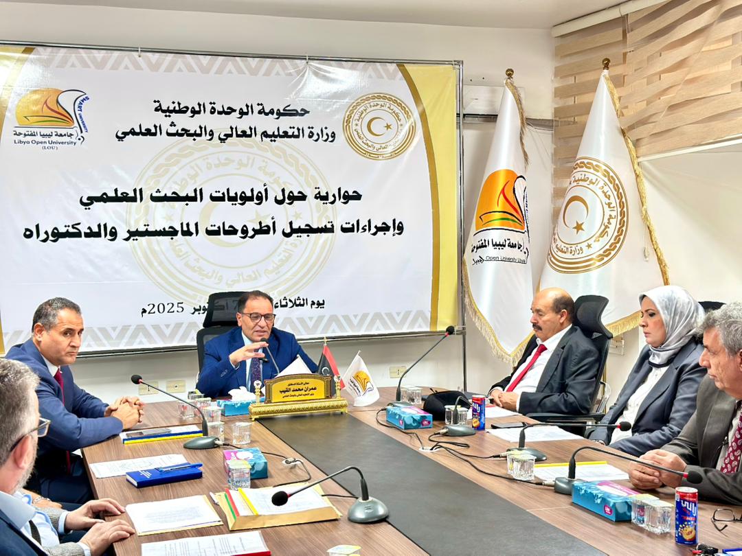 بحضور معالي السيد الأستاذ الدكتور عمران محمد القيب وزير التعليم العالي والبحث، والسيد الأستاذ الدكتور أبوالقاسم محمد شلوف رئيس جامعة ليبيا المفتوحة، أنطلقت أعمال الحوارية التي عقدت تحت عنوان ( أولويات البحث العلمي وإجراءات تسجيل رسائل الماجستير وأطروحات الدكتوراه ) وذلك بقاعة الإجتماعات بديوان رئاسة جامعة ليبيا المفتوحة اليوم الثلاثاء الموافق 7 أكتوبر 2025م، بمشاركة كل من السيد الأستاذ الدكتور عطية محمد لربش مدير إدارة الدراسات العليا بالوزارة، والسيد الأستاذ الدكتور علي أحمد سالم مدير مكتب شئون الوزارة، والسيدة الدكتورة نعيمة محمد الجدي وكيل الشئون العلمية بجامعة ليبيا المفتوحة، والسيد الأستاذ الدكتور عبدالحكيم المبروك قلية مدير إدارة البحوث بمجلس التخصصات الطبية، وفريق البرنامج الوطني لتطوير المجلات الليبية المحكمة، وعدد من مدراء إدارات الدراسات العليا، والمكاتب، والأكاديمين والخبراء والمختصين من مختلف الجامعات والمؤسسات التعليمية والمراكز البحثية.