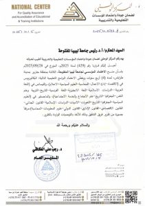 تهنئة المركز الوطني لضمان جودة وإعتماد المؤسسات التعليمية والتدريبية للسيد الأستاذ الدكتور أبوالقاسم محمد شلوف رئيس جامعة ليبيا المفتوحة بشأن