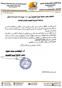 تعميم رئيس جامعة ليبيا المفتوحة رقم (10) لسنة 1447 هـ / 2025 ميلادي بشأن مراجعة البرامج العلمية بأقسام الجامعة.