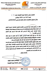 تعميم رئيس جامعة ليبيا المفتوحة رقم (9) لسنة 1447 هـ / 2025 ميلادي بشأن تسجيل المحاضرات خلال العام الدراسي 2026/2025م.