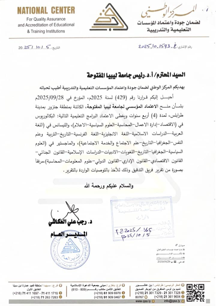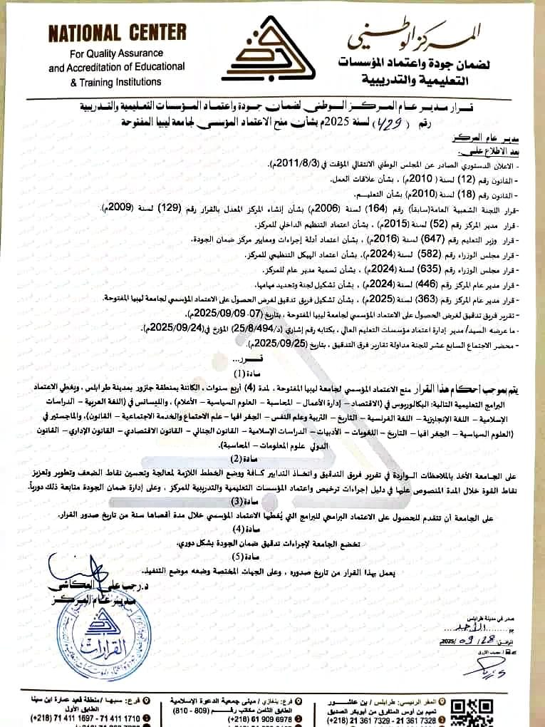 قرار مدير عام المركز الوطني لضمان جودة وإعتماد المؤسسات التعليمية والتدريبية رقم ( 429 ) لسنة 2025م بشأن منح الإعتماد المؤسسي لجامعة ليبيا المفتوحة.