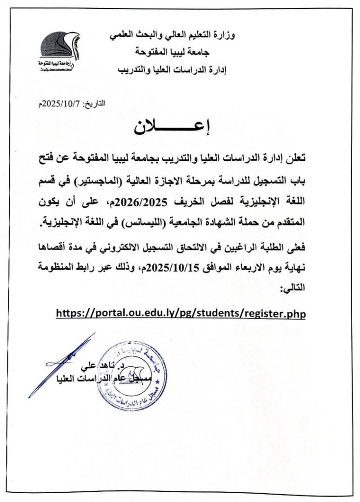 تعلن إدارة الدراسات العليا والتدريب بجامعة ليبيا المفتوحة عن فتح باب التسجيل للدراسة بمرحلة الاجازة العالية (الماجستير) في قسم اللغة الإنجليزية لفصل الخريف 2025/2026م، على أن يكون المتقدم من حملة الشهادة الجامعية (الليسانس) في اللغة الإنجليزية. فعلى الطلبة الراغبين في الالتحاق التسجيل الالكتروني في مدة أقصاها نهاية يوم الاربعاء الموافق 15/10/2025م، وذلك عبر رابط المنظومة […]