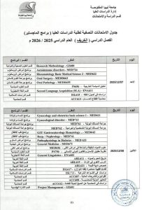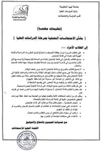الطلبة الأعزاء المتقدمون للإمتحانات النصفية بمرحلة الماجستير سيكون بأذن الله مكان الإمتحانات بالمعهد المتوسط للمهن الشاملة أوباري في مقر فرع الجامعة يوم الأحد الموافق 7/12/2025. علي تمام الساعة 11:00صباحا. يطلب الحضور قبل وقت الإمتحان بنصف ساعة ونأمل من الطلبة التقيد بالتعليمات المهمة المرفقة في الإعلان .
