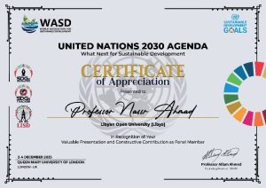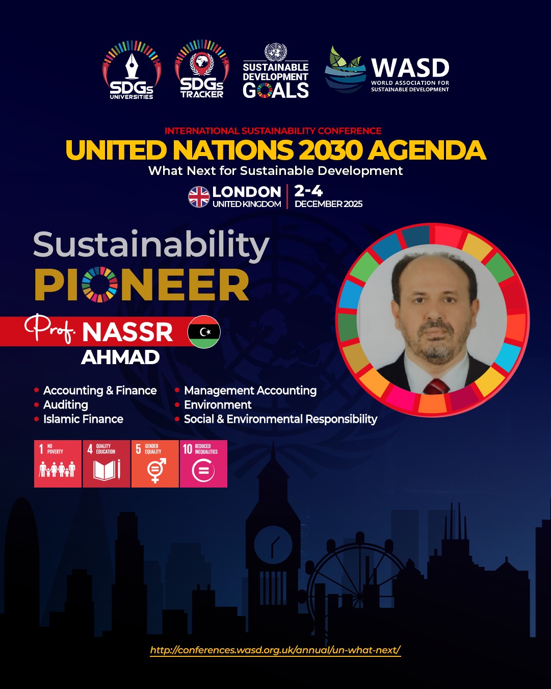 مشاركة السيد الأستاذ الدكتور نصر أحمد عضو هيئة التدريس بقسم المحاسبة بجامعة ليبيا المفتوحة بالمؤتمر الدولي السنوي لمنظمة التنمية المستدامة في لندن يوم 2 – 4 ديسمبر 2025م، بثلاث ورقات علمية بأسم جامعة ليبيا المفتوحة.