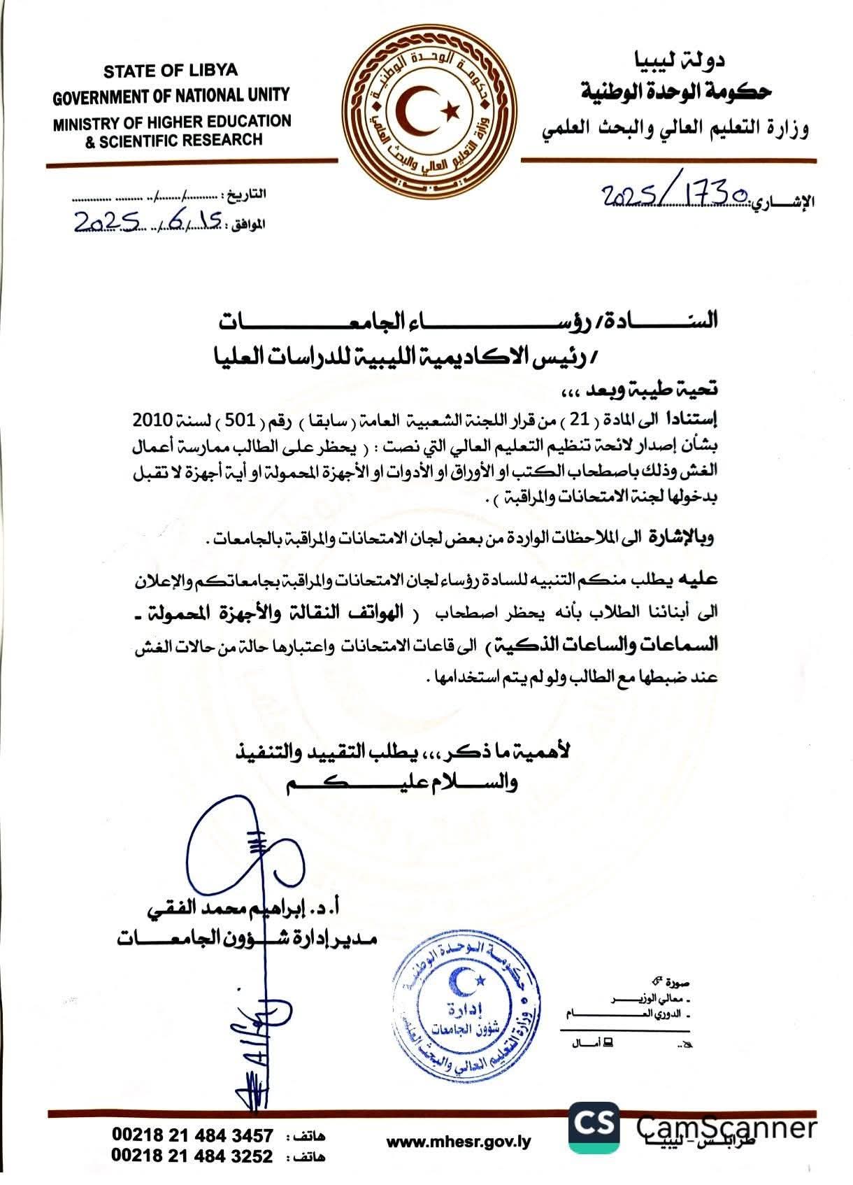 يطلب من جميع طلاب جامعة ليبيا المفتوحة الممتحنين بالفصل الدراسي الأول(الخريف/ديسمبر) للعام الجامعي 2025-2026م، ضرورة الإلتزام بالتنبيهات والملاحظات الواردة برسالة مدير إدارة شؤون الجامعات بوزارة التعليم العالي والبحث العلمي رقم 1730/2025 بتاريخ 2025/6/15م، والمرفقة بهذا التنبيه، والمتعلقة بحظر اصطحاب( الهواتف النقالة والأجهزة المحمولة، السماعات والساعات الذكية ) إلى قاعات الإمتحانات واعتبارها حالة من حالات الغش عند ضبطها مع الطالب ولو لم يتم يستخدمها.