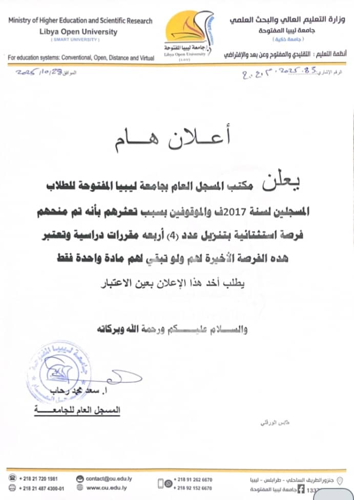 إعلان مكتب المسجل العام بجامعة ليبيا المفتوحة للطلاب المسجلين خلال العام 2017م والمتعثرين في دراستهم بالجامعة.